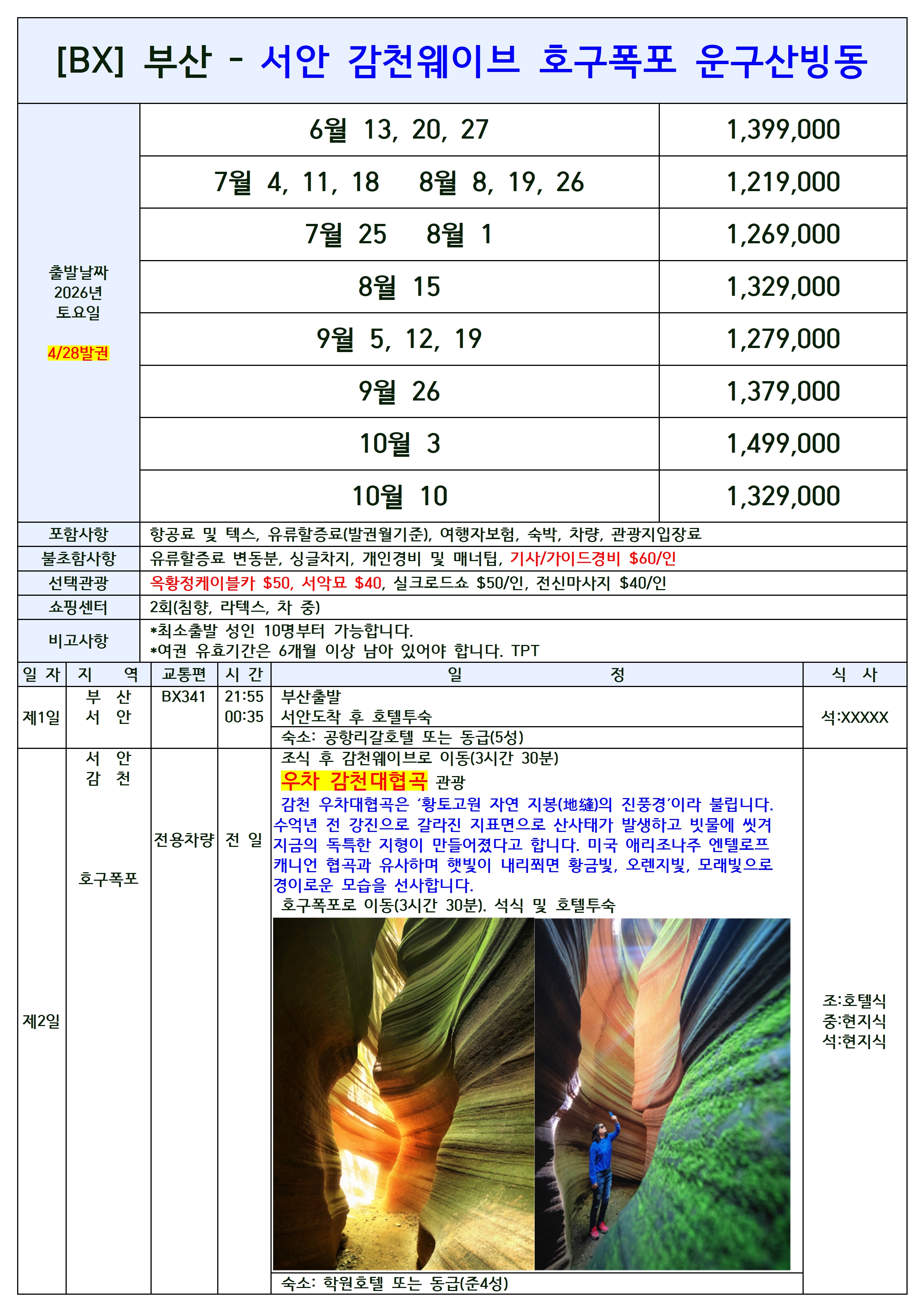 🌈 빛의 마법 감천대협곡 ❄️ 얼음왕국 운구산 빙동 ⛲ 야생미 가득한 거친 매력의 호구폭포 많은분들이 오픈부터 문의해준 감천웨이브 상품!! 광활한 중국 대륙에 존재하는 수많은 관광지! ▶빛이 스며드는 모습이 “대자연의 미술관”이라 불리는 중국의 숨겨진 보석 감천대협곡(甘泉大峡谷) ▶중국 지폐에 인쇄될 정도로 유명한 황색폭포 황하 호구폭포 ▶여름에도 녹지않는 세계 3대 빙동중에 하나인 운구산 빙동