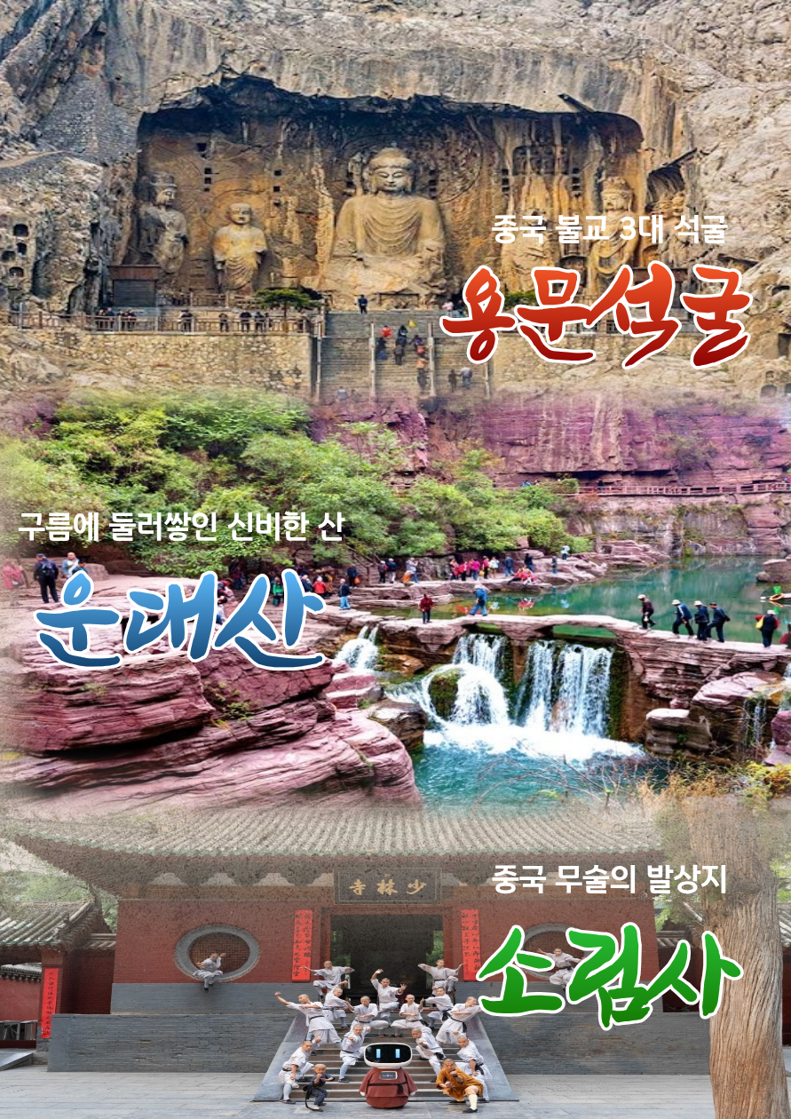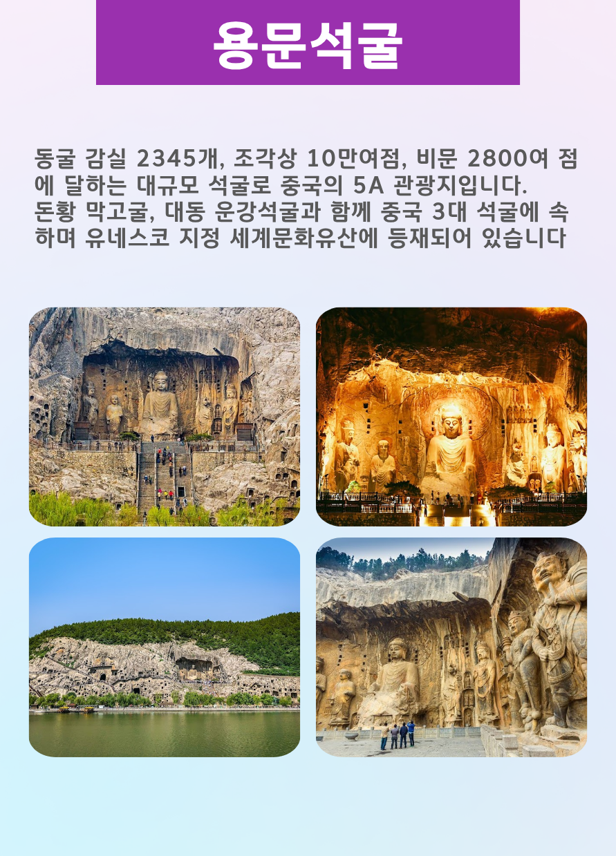 동굴 감실 2345개, 조각상 10만여점, 비문 2800여 점에 달하는 대규모 석굴로 중국의 5A 관광지입니다. 돈황 막고굴, 대동 운강석굴과 함께 중국 3대 석굴에 속하며 유네스코 지정 세계문화유산에 등재되어 있습니다