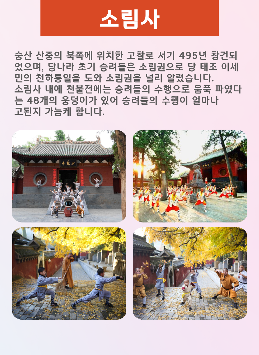 숭산 산중의 북쪽에 위치한 고찰로 서기 495년 창건되었으며, 당나라 초기 승려들은 소림권으로 당 태조 이세민의 천하통일을 도와 소림권을 널리 알렸습니다. 소림사 내에 천불전에는 승려들의 수행으로 움푹 파였다는 48개의 웅덩이가 있어 승려들의 수행이 얼마나 고된지 가늠케 합니다.