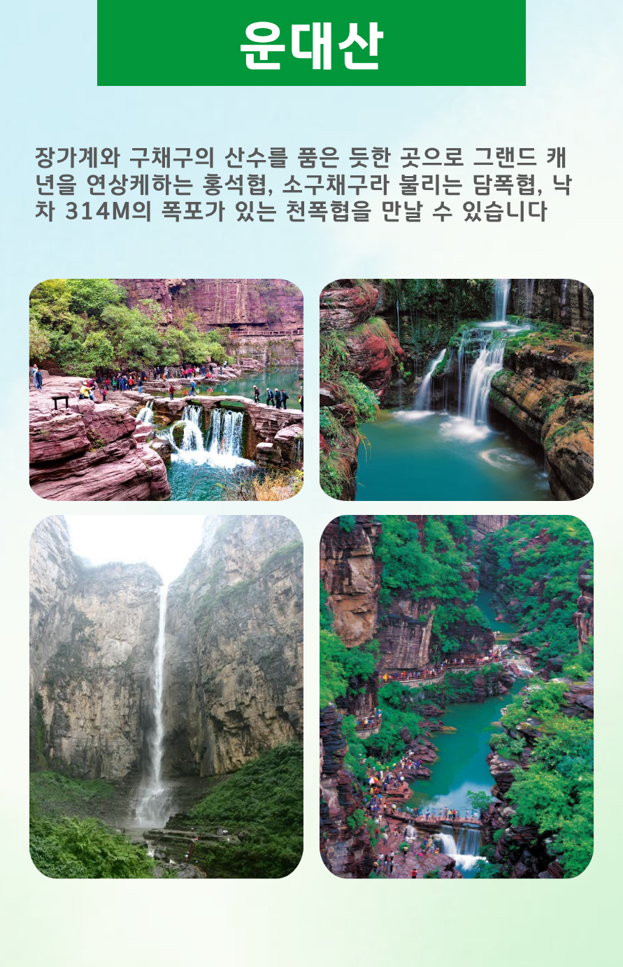 장가계와 구채구의 산수를 품은 듯한 곳으로 그랜드 캐년을 연상케하는 홍석협, 소구채구라 불리는 담폭협, 낙차 314M의 폭포가 있는 천폭협을 만날 수 있습니다