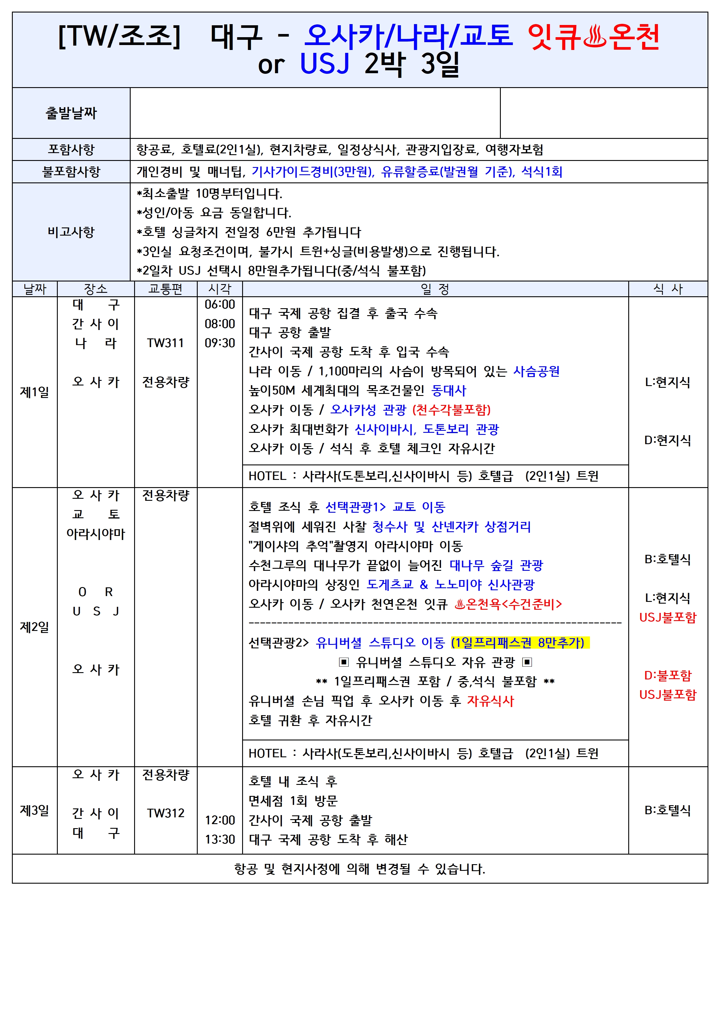 [대구출발] 오사카 나라 교토 3일 관광 or USJ 티웨이항공 조조패턴