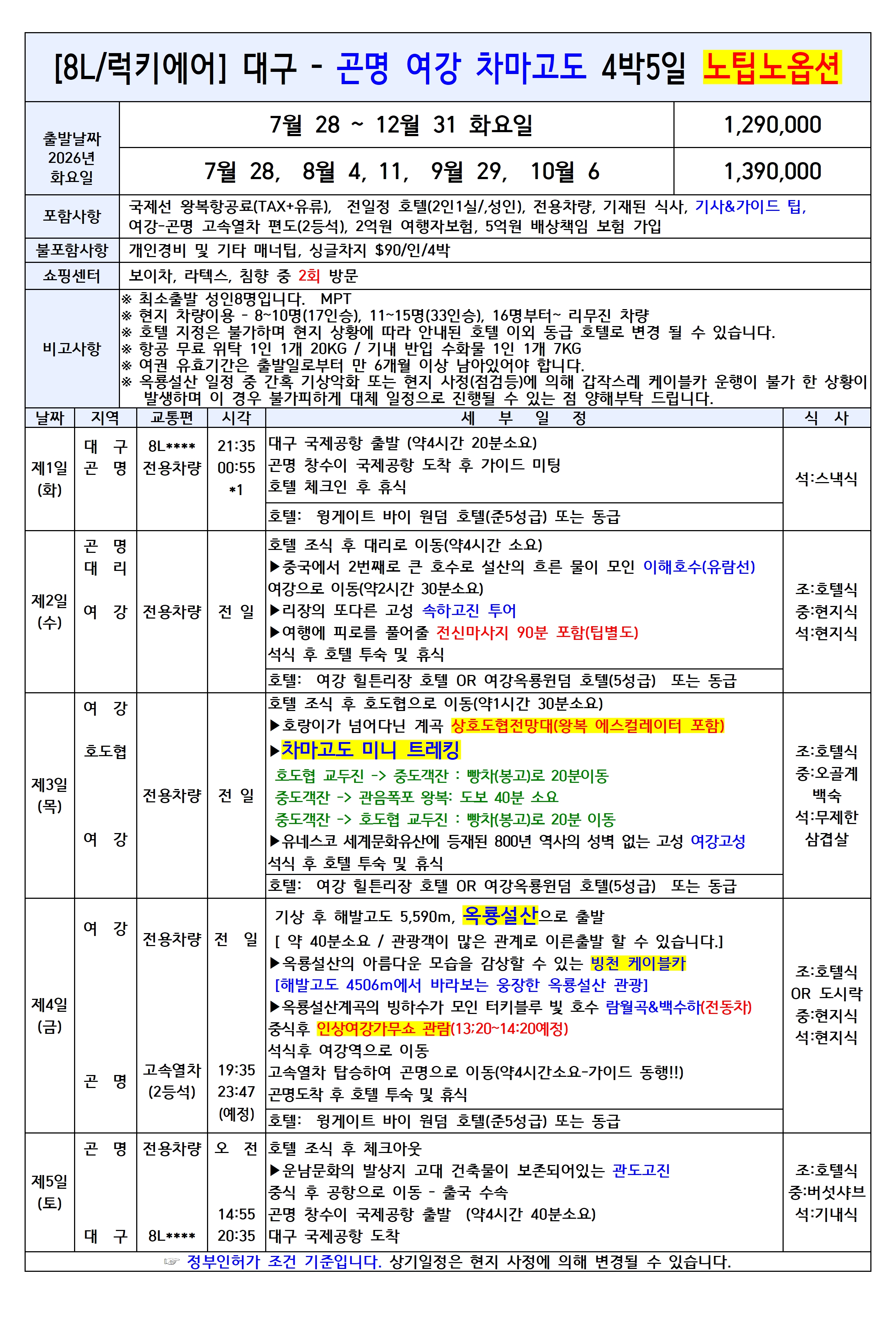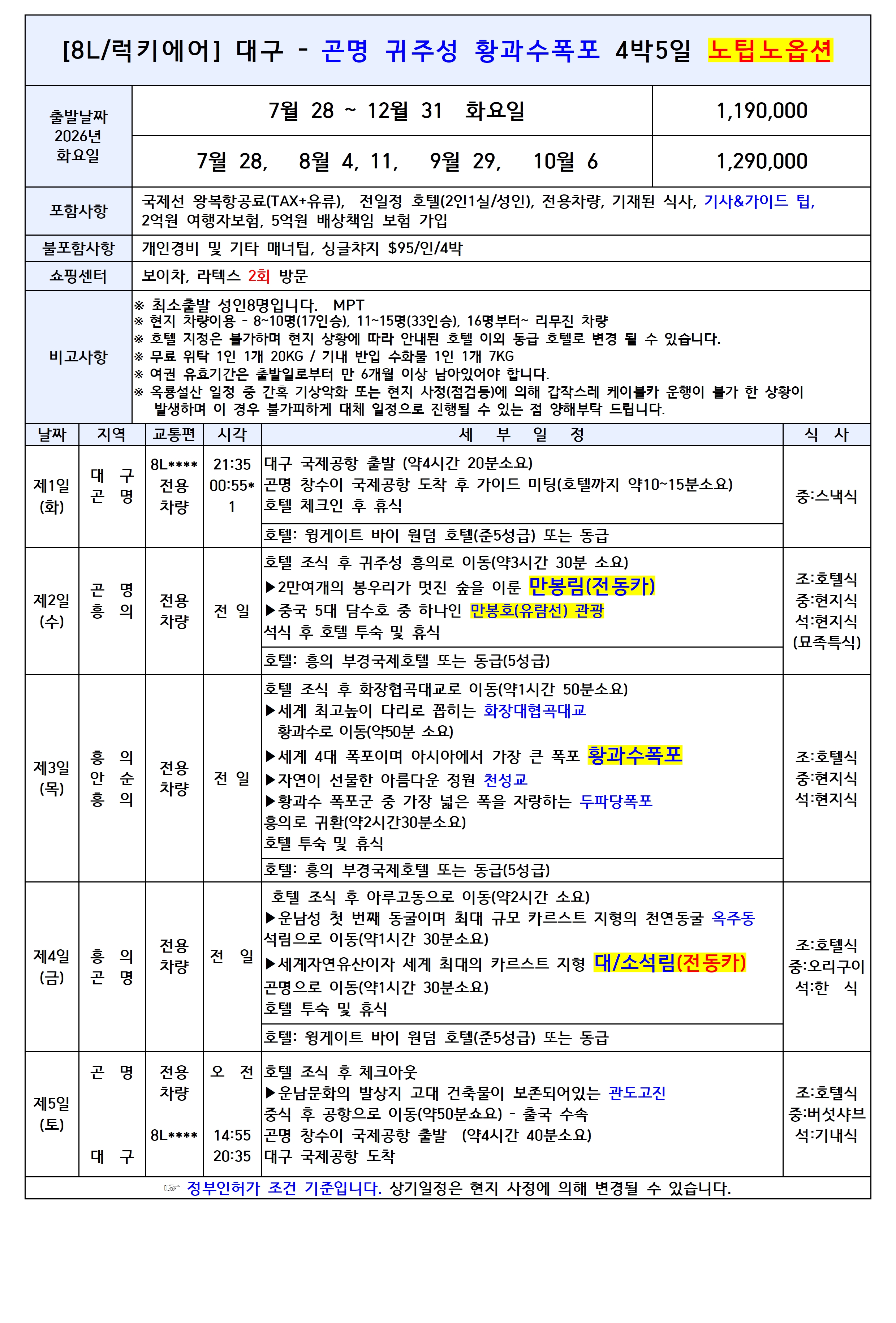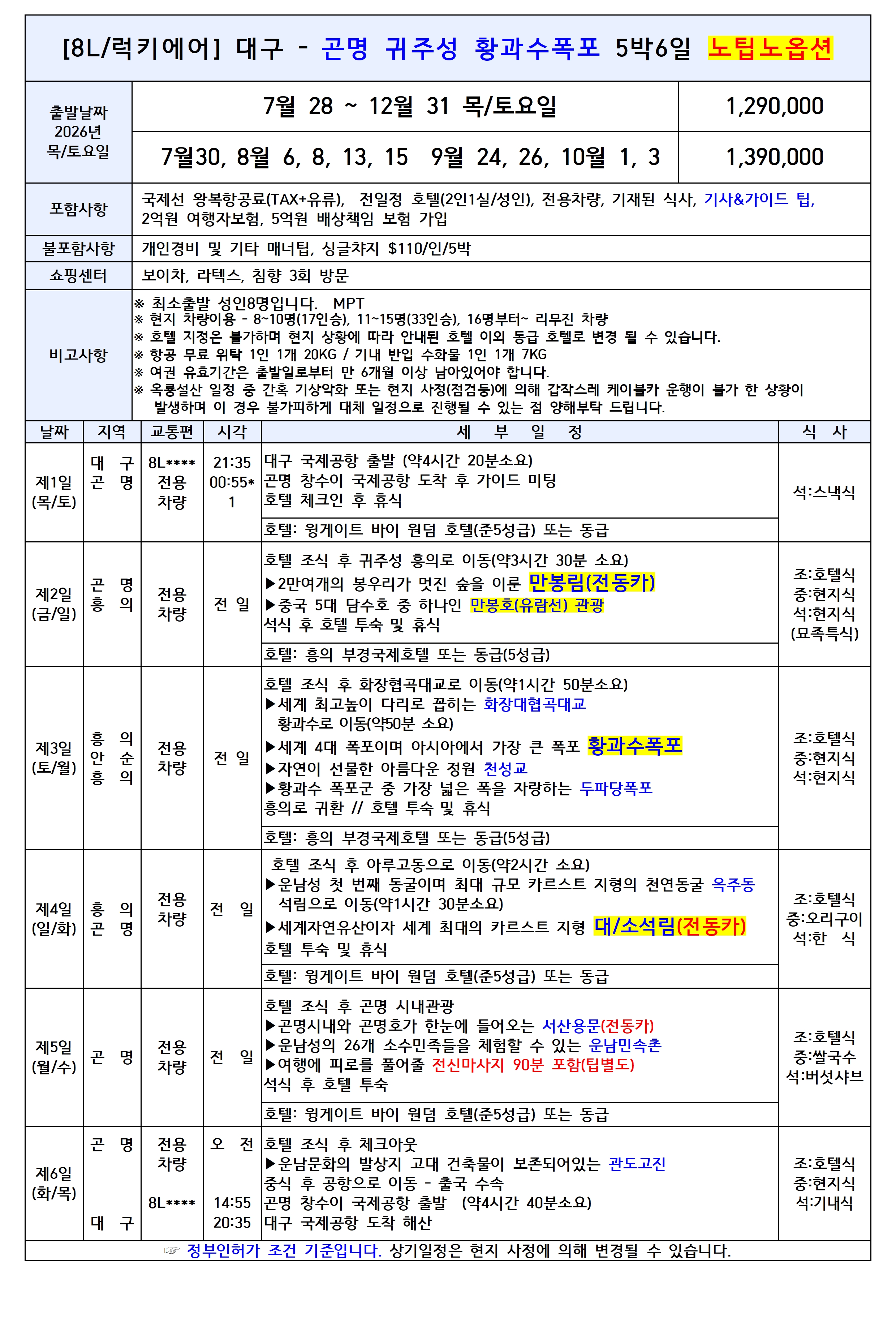 [대구출발] 곤명 여강 귀주성 패키지 럭키항공