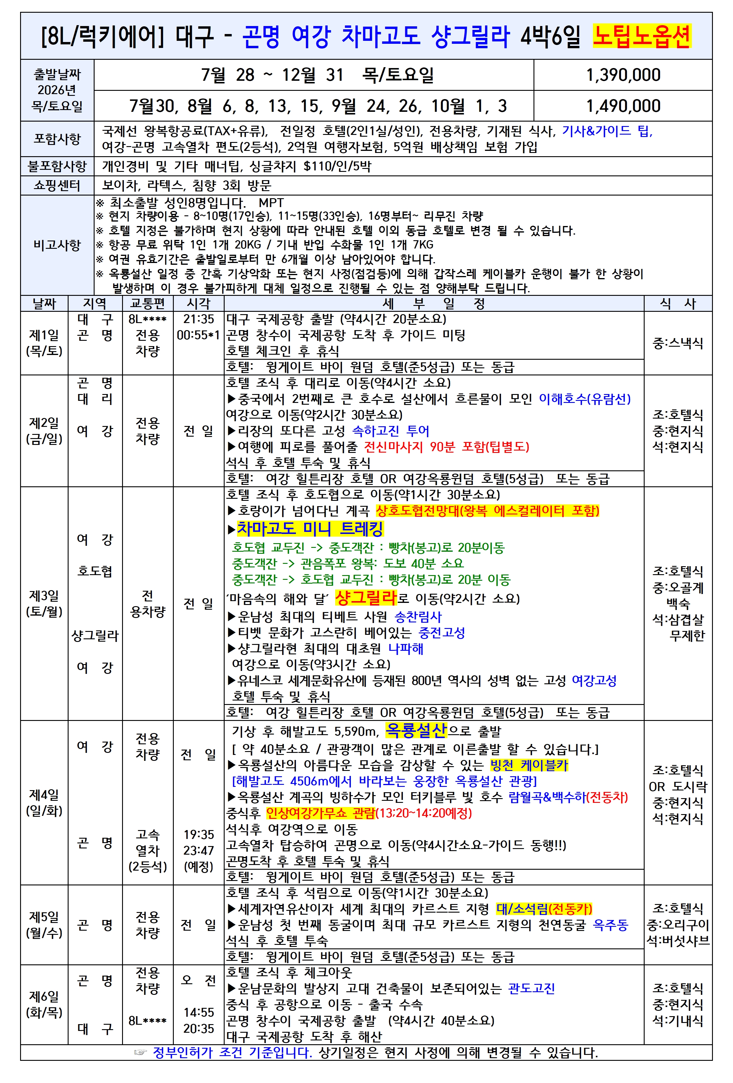 # 대구직항 옥룡설산 차마고도 샹그릴라 옥룡설산, 차마고도, 샹그릴라 대구 직항으로 편리한 여정!! 1년내 봄 날씨, 여름에도 시원한 옥룡설산 ❤️🧡💛 7/28부터 대구 직항 취항💚💙💜