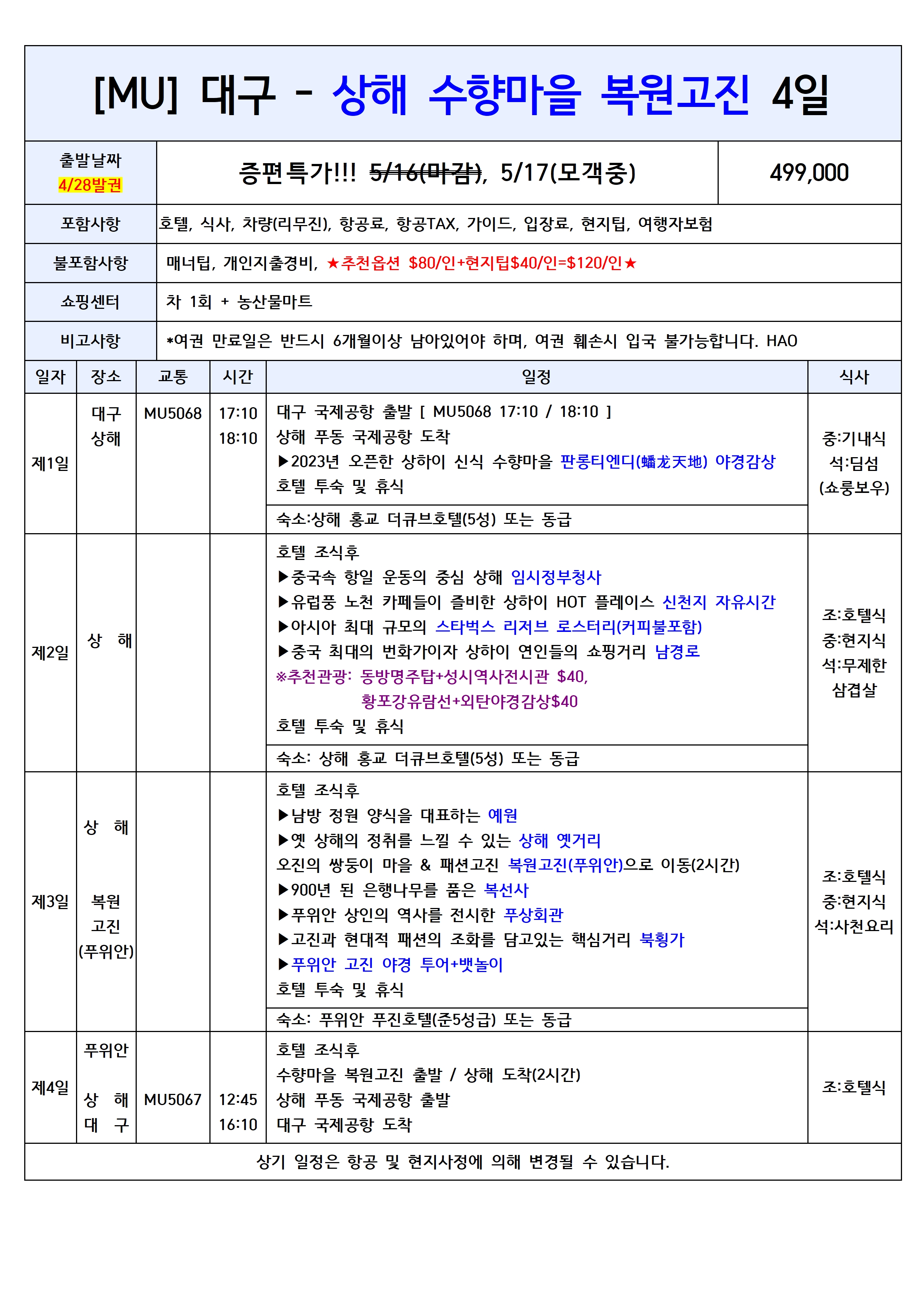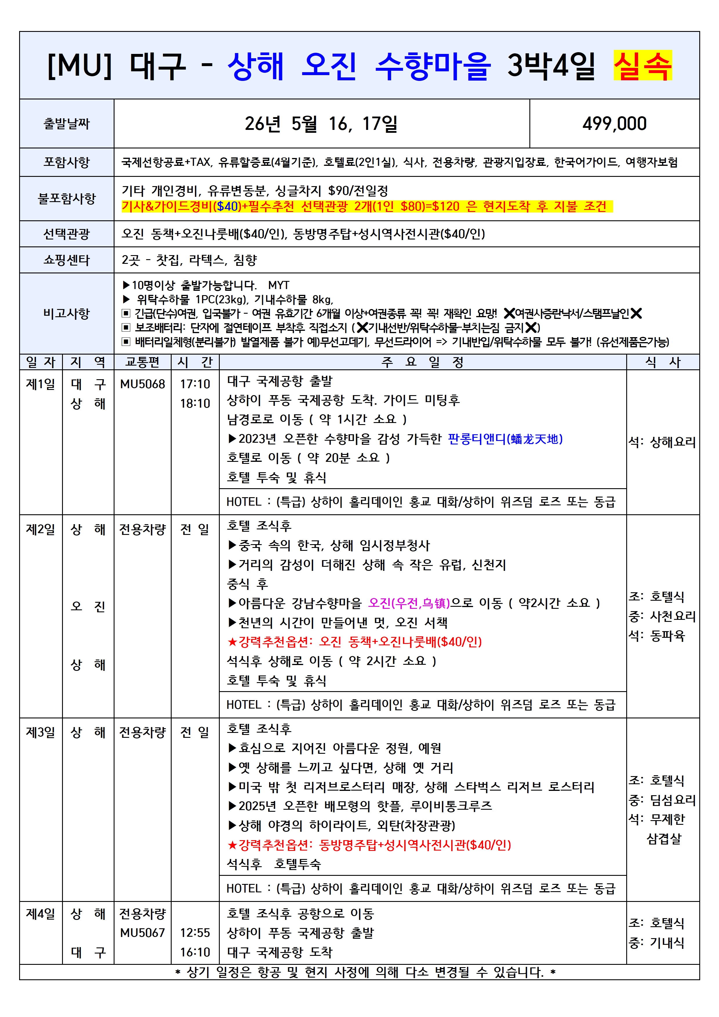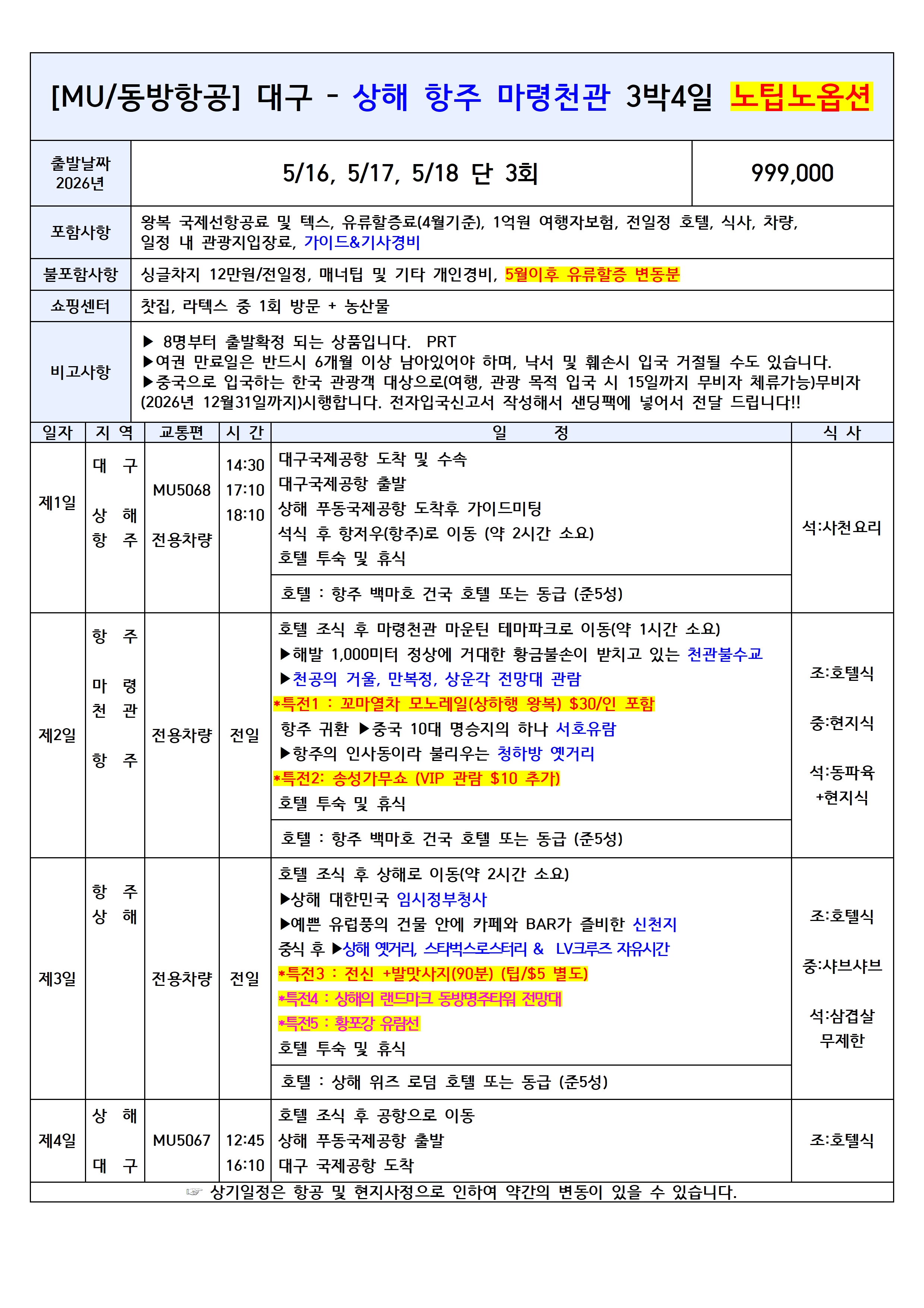 🏙️ 대구출발 중국 상해 여행 ✈️ 중국동방항공 🔥선착순 특가 / 집중모객 / 출발확정 상품 모음